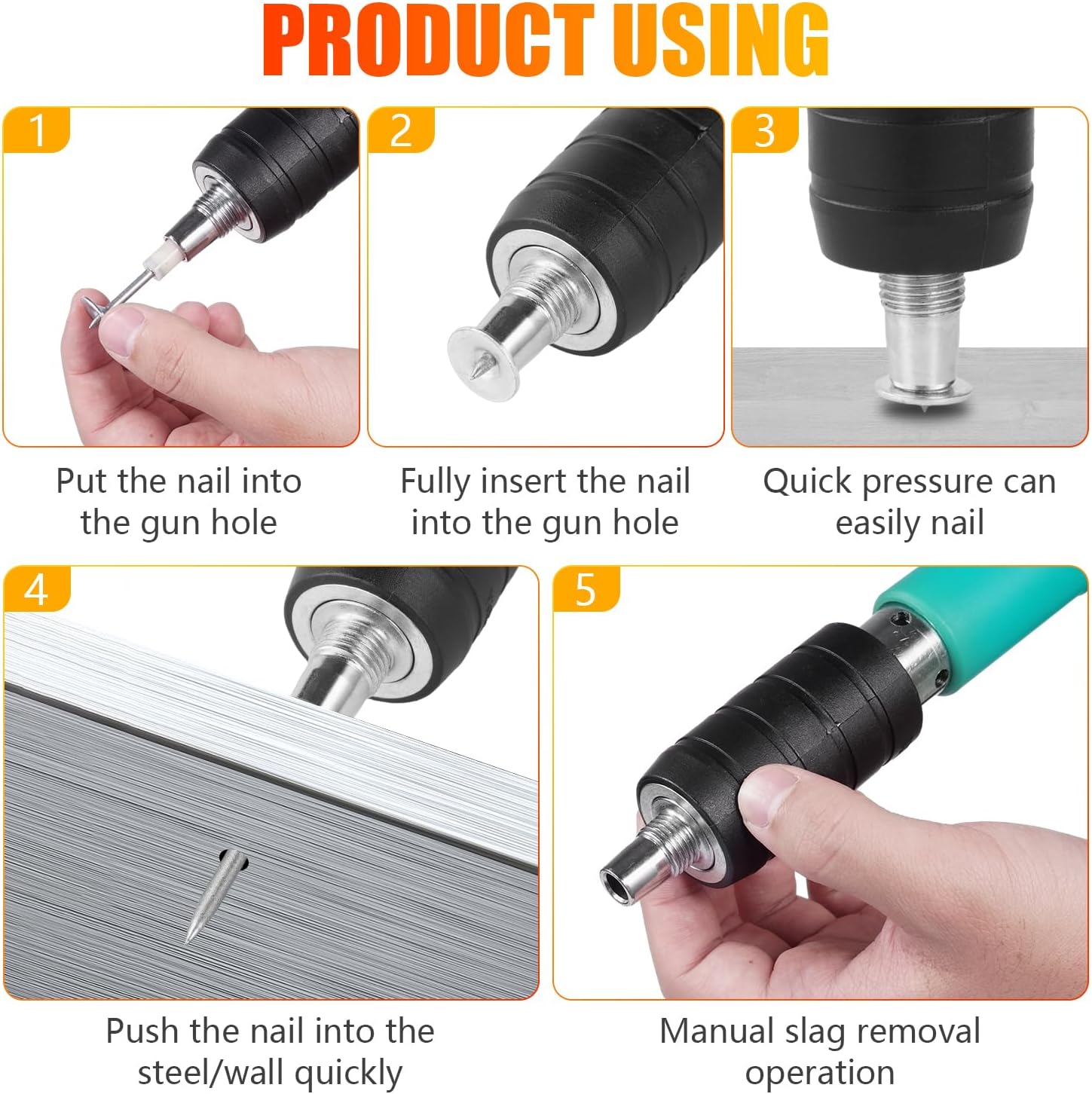 - 【Easy Operation】This lightweight concrete nail gun is powered by hand. Easy to use, just five simple steps: 1. Wear protective glasses, gloves, and earplugs; 2. Choose the nail; 3. Nail gun vertically at the workplace; 4. Vertical force into the wall; 5. Hold the muffler cover, and compress it many times. If occurs can't work, please delete the residue before trying a few more nails.